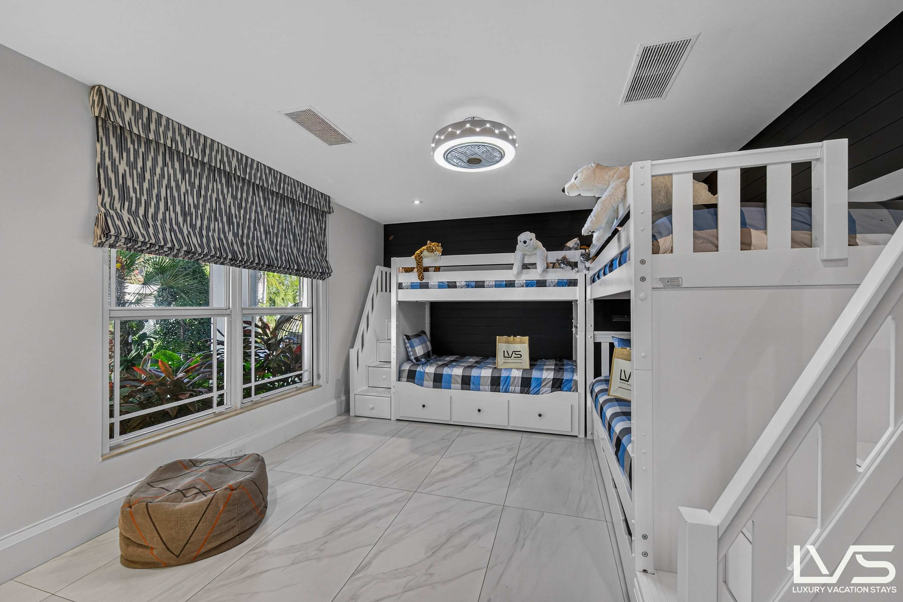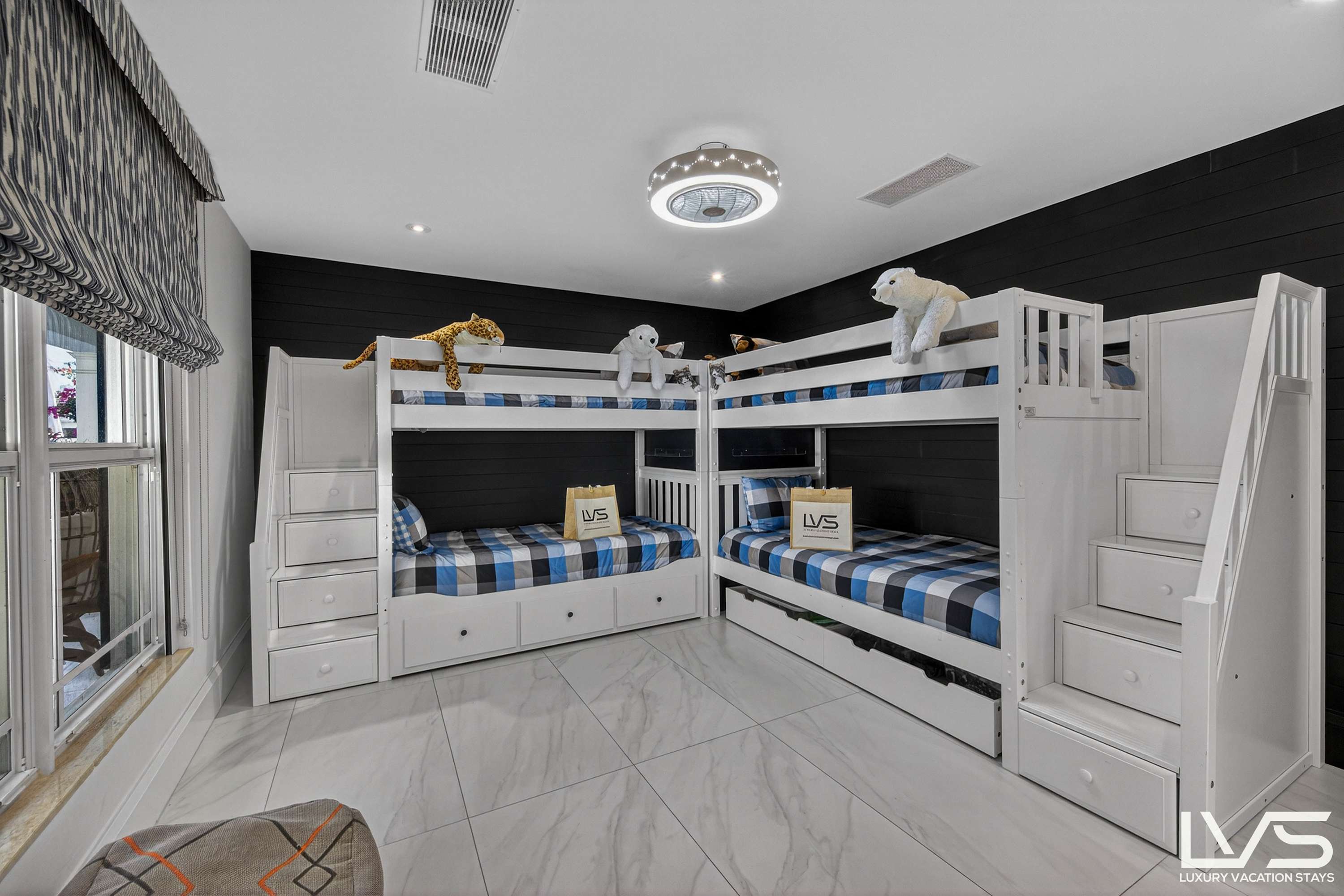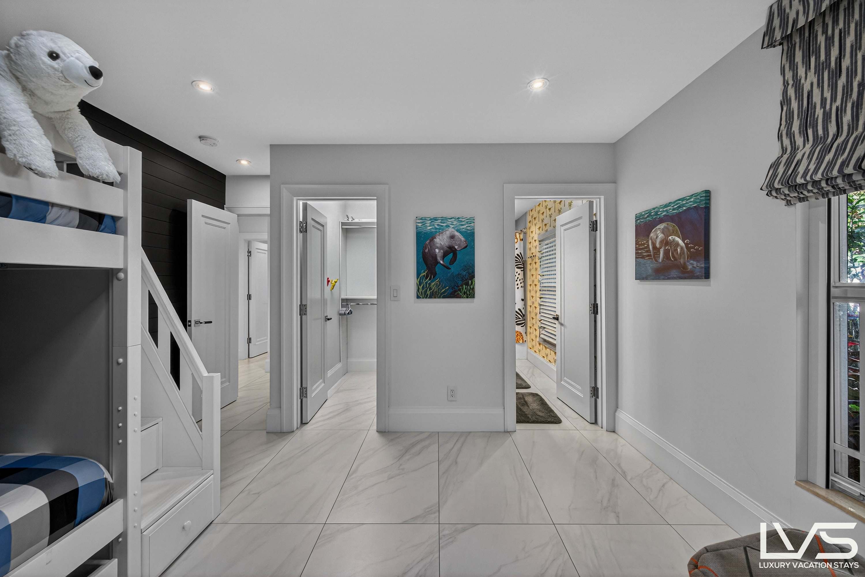 ● Suite #4 – Bunk Bedroom: Perfect for families, this suite features two twin beds (1st bunk) and one twin & one king bed OR 1 twin on the bottom (2nd bunk), plus a walk-in closet, shades, and a selection of children’s books and toys. The ensuite bathroom includes a shower/tub combo and toilet.