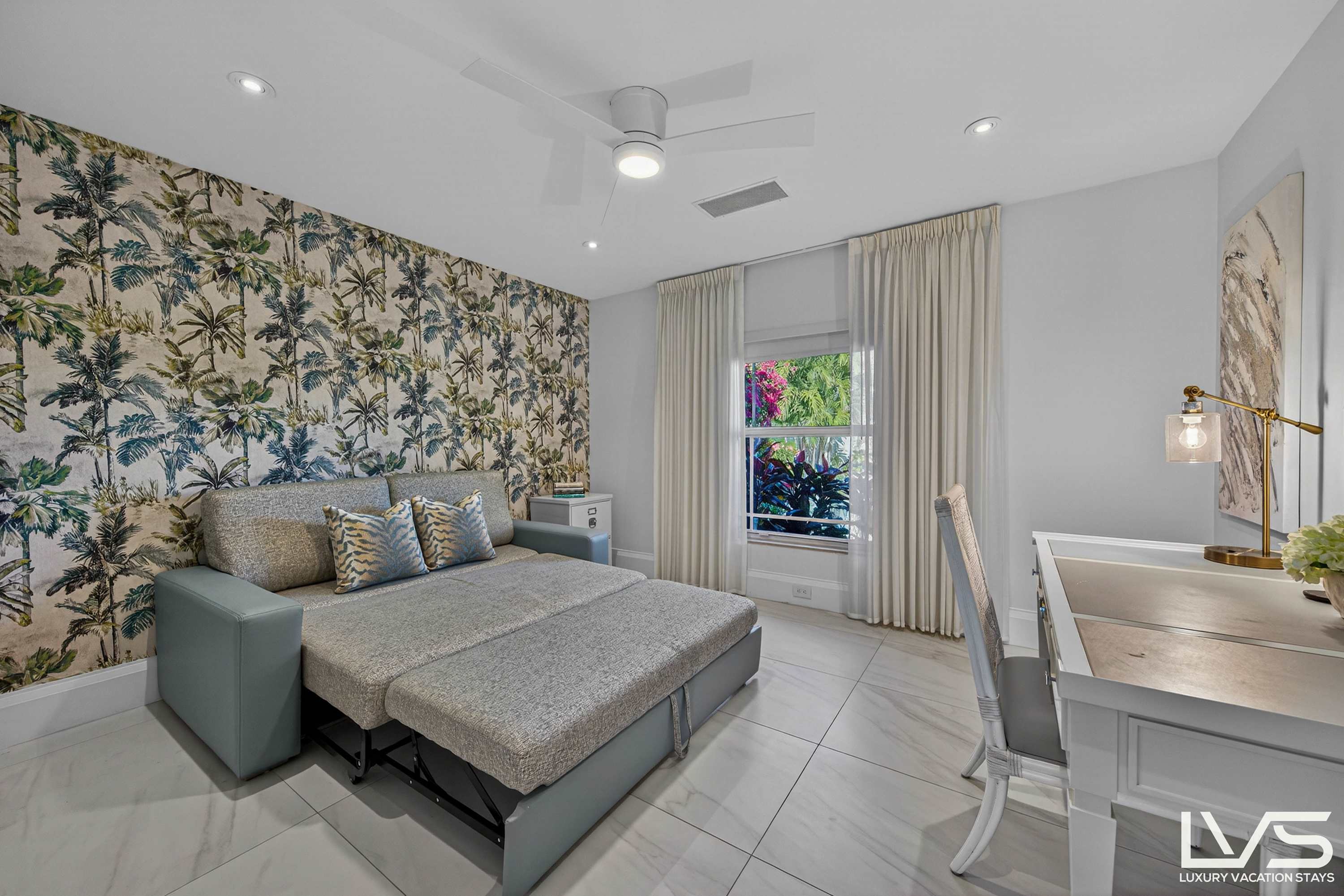 ● Suite #5 / Den: Flexible space with a queen sofa sleeper, workstation desk & chair, closet, and shades. Guests access the cabana bathroom in the hallway with a shower/tub combo and toilet.