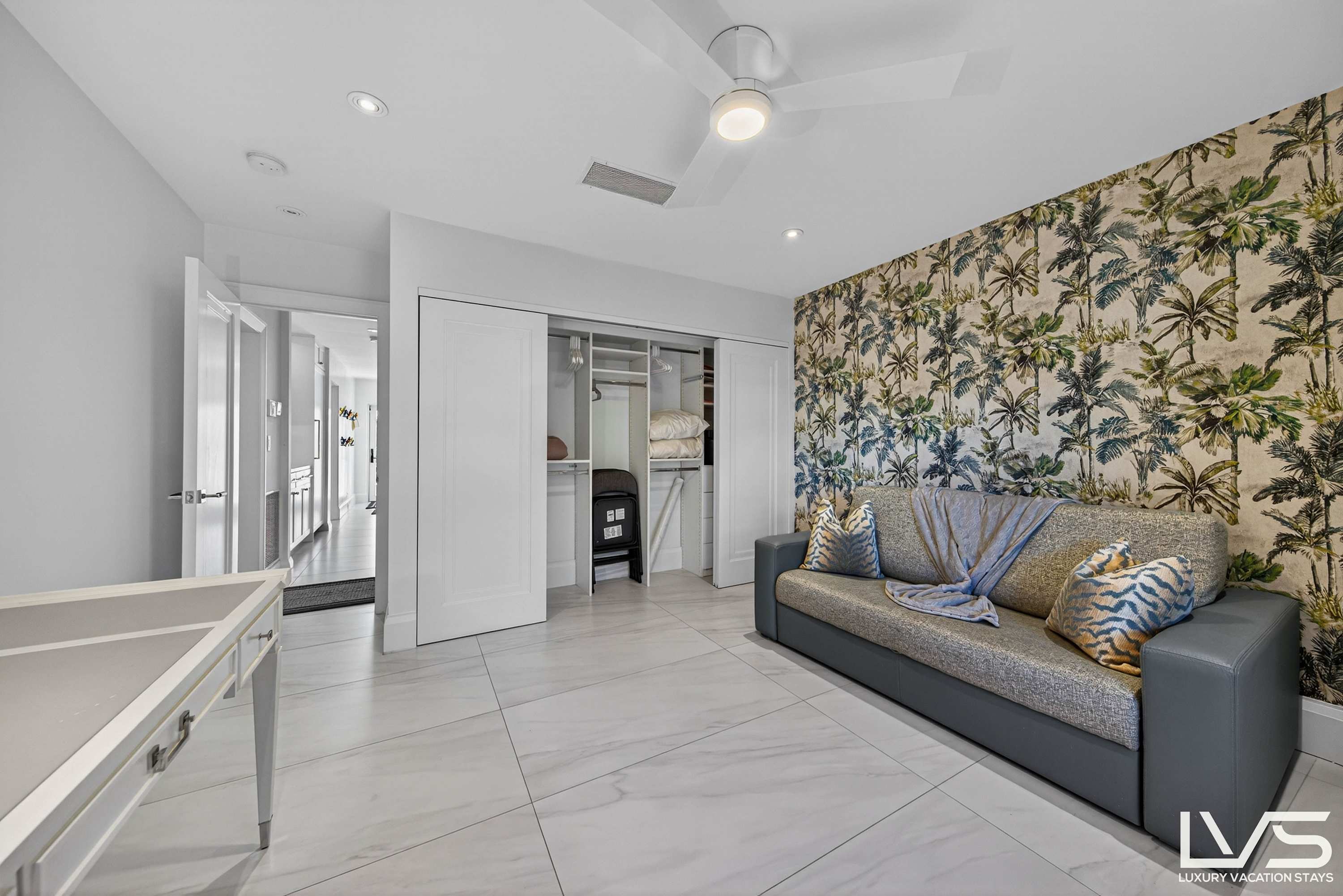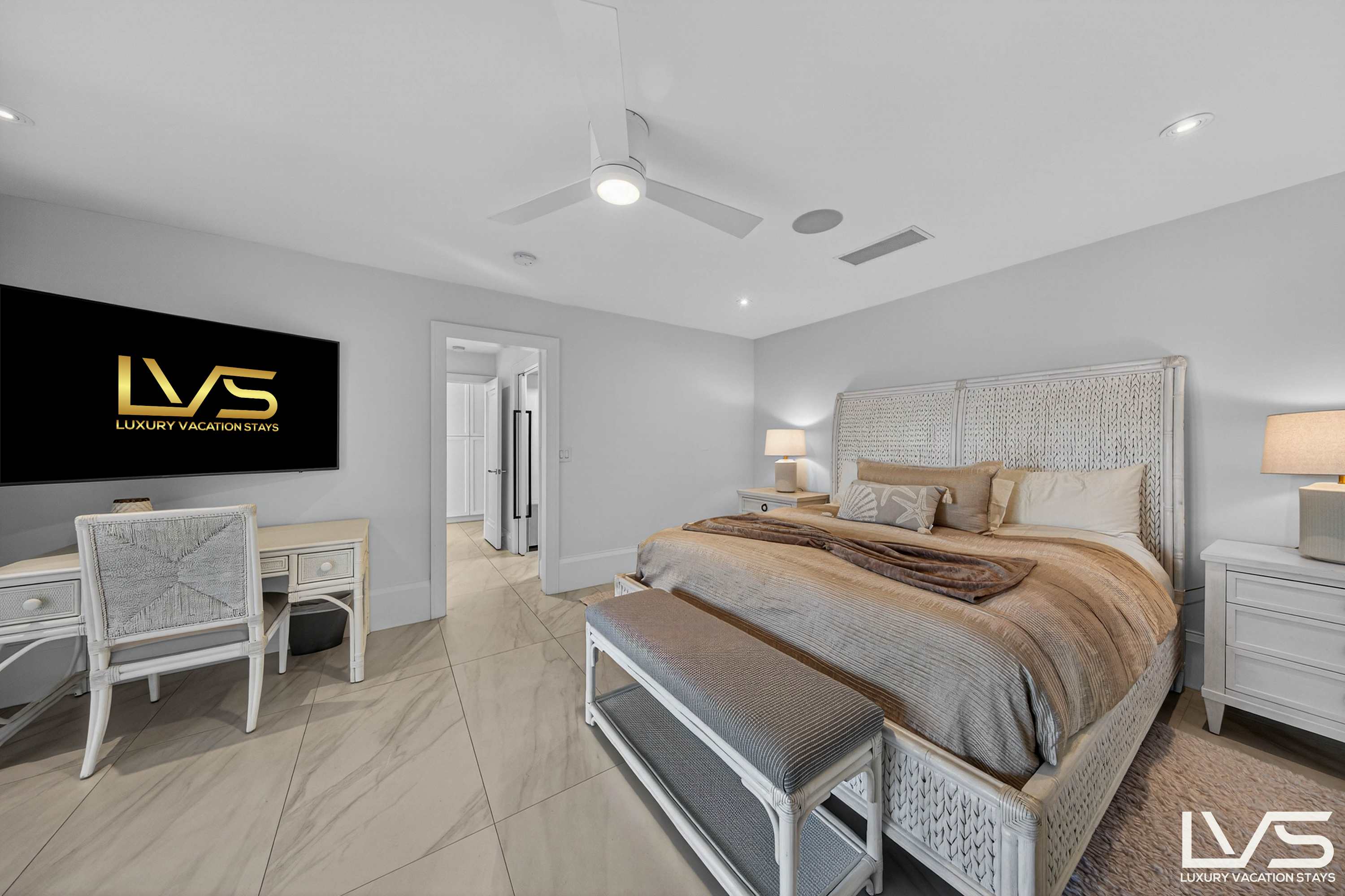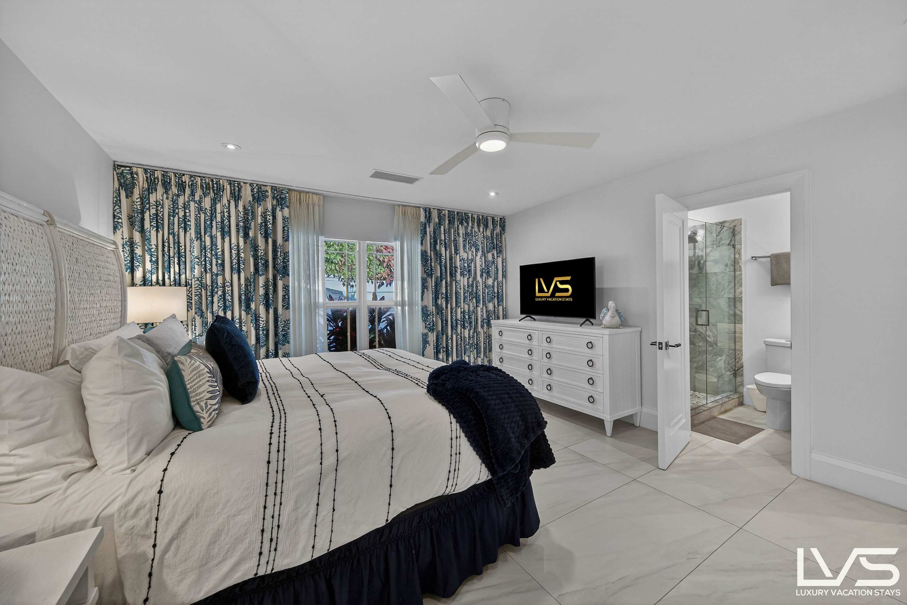 ● Primary Suite #2 (Pool View with Outdoor Access): Thoughtfully designed with a king-size bed, Smart TV, workstation desk & chair, shades, and walk-in closet. Guests enjoy private access to the pool and a modern ensuite bathroom with shower and toilet.