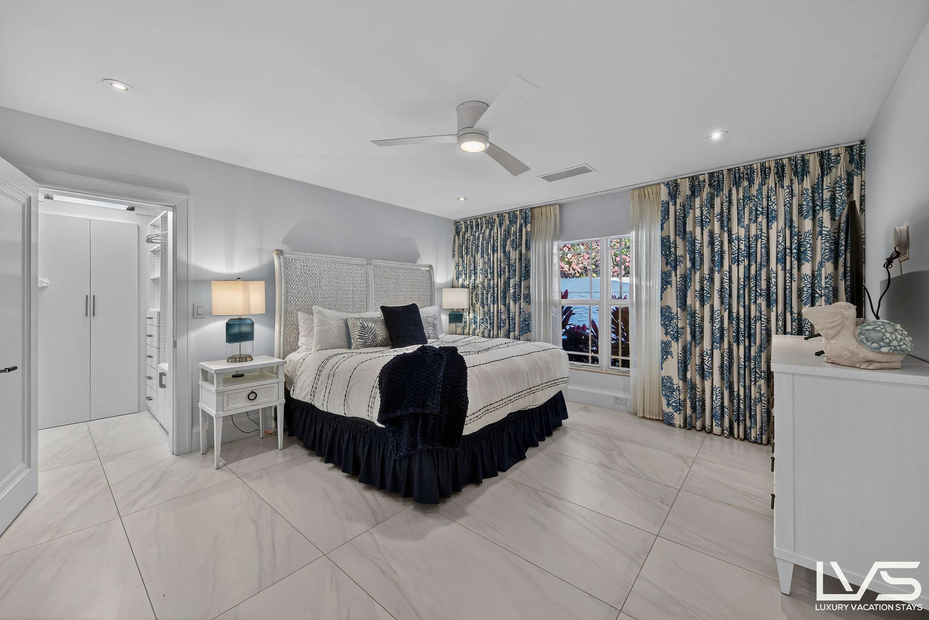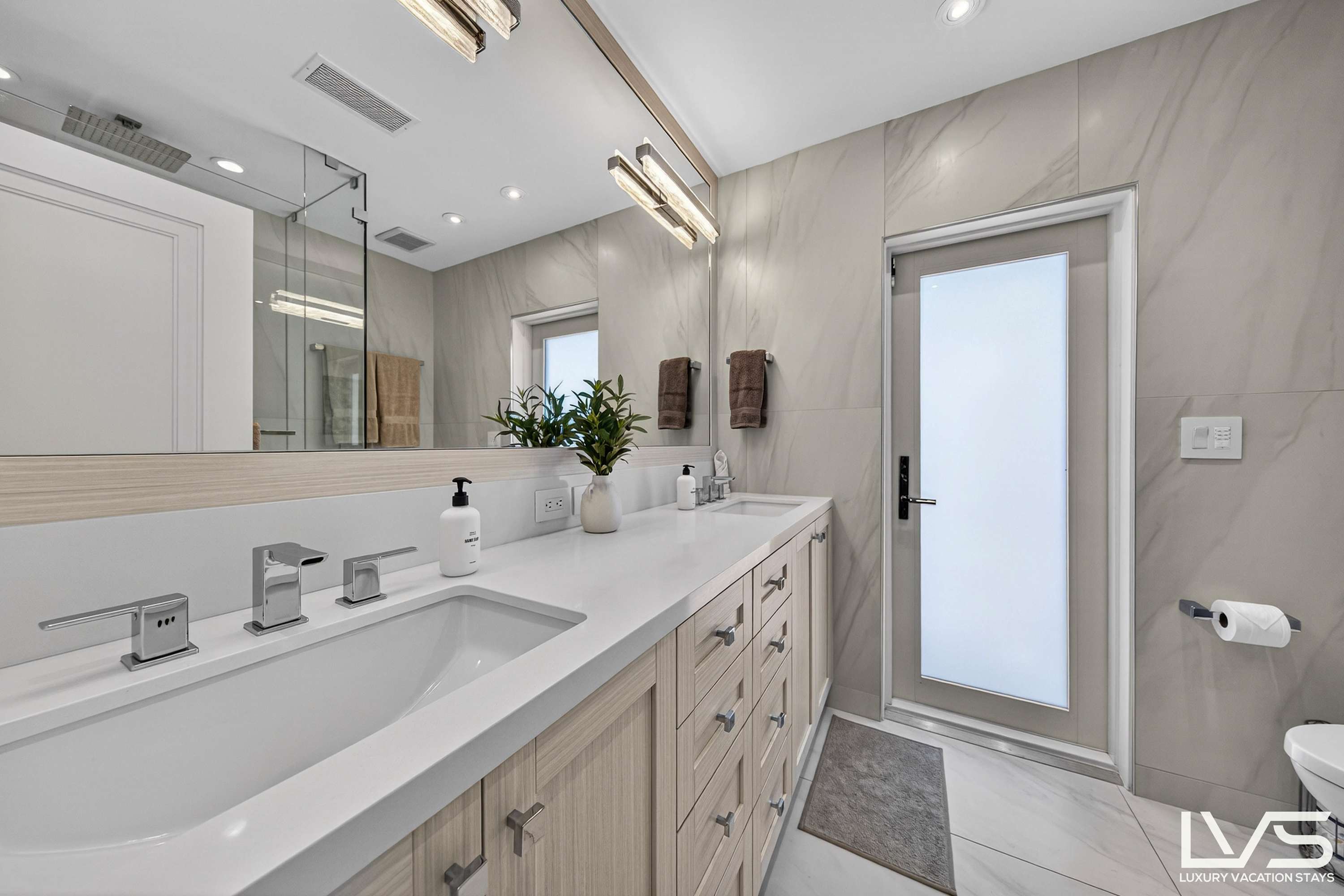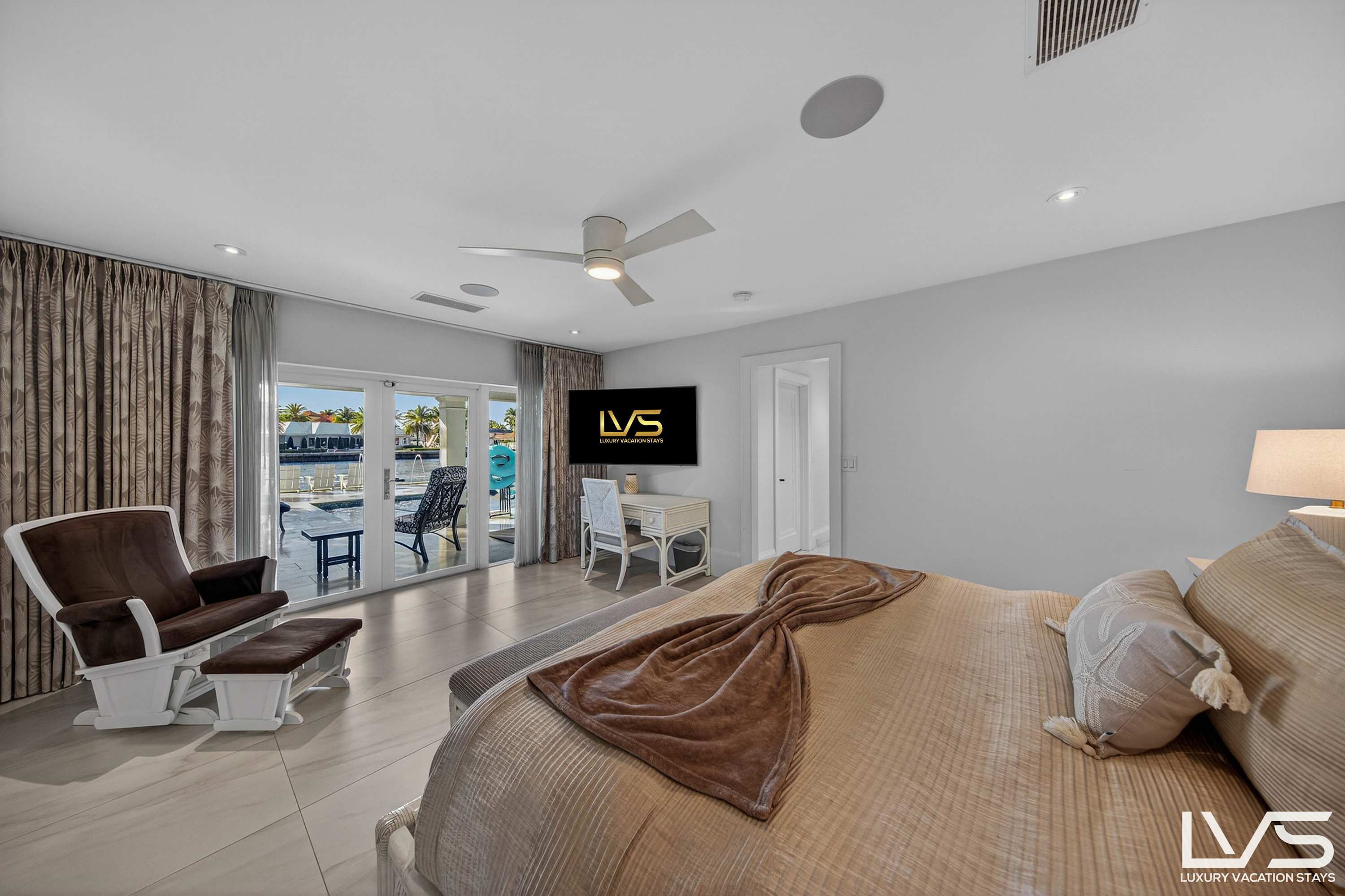 ● Primary Suite #2 (Pool View with Outdoor Access): Thoughtfully designed with a king-size bed, Smart TV, workstation desk & chair, shades, and walk-in closet. Guests enjoy private access to the pool and a modern ensuite bathroom with shower and toilet.