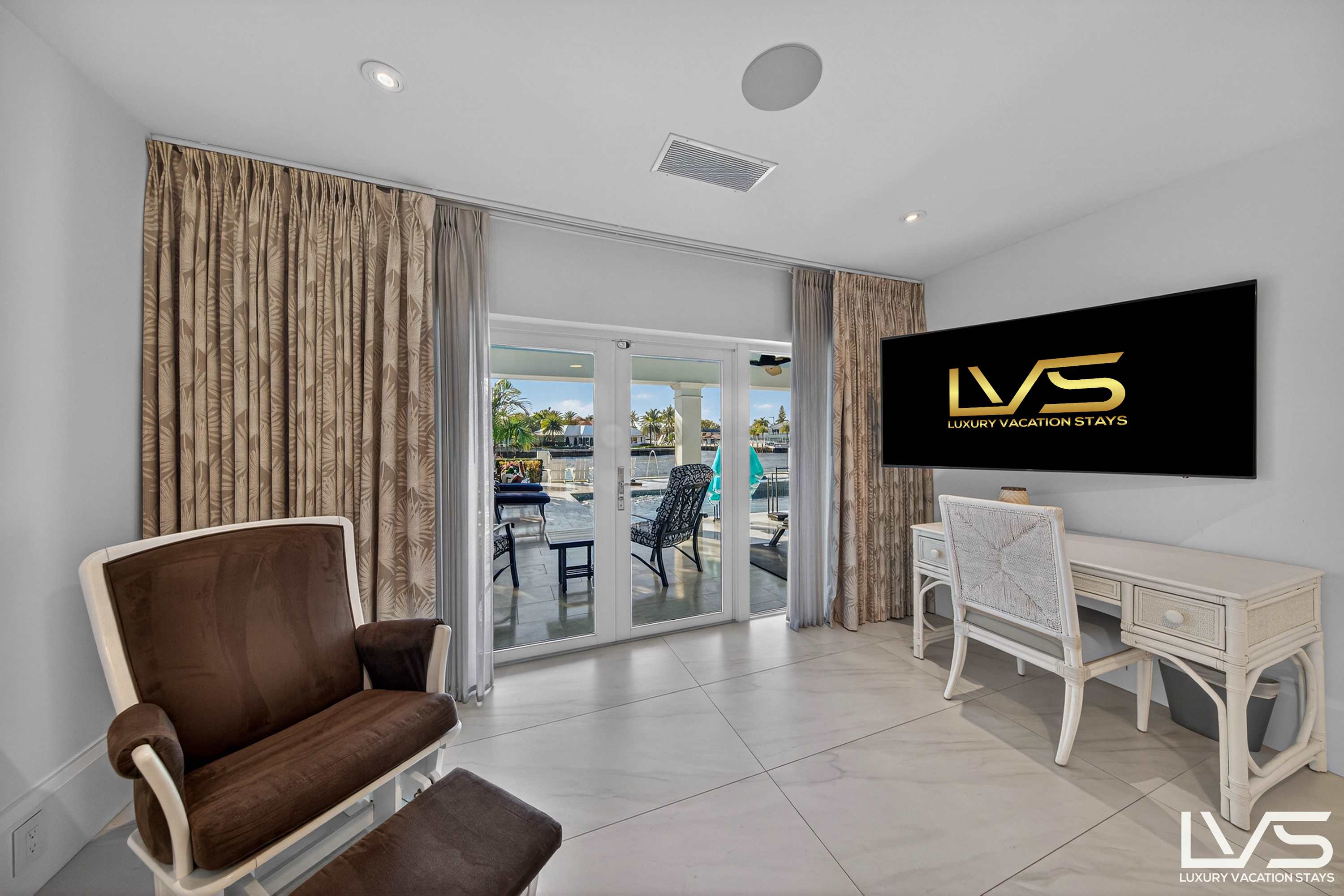 ● Living Room: Spacious pool-view gathering area with L-shaped sofa, lounge chairs, ottoman seating, and Smart TV—perfect for relaxation or entertaining.