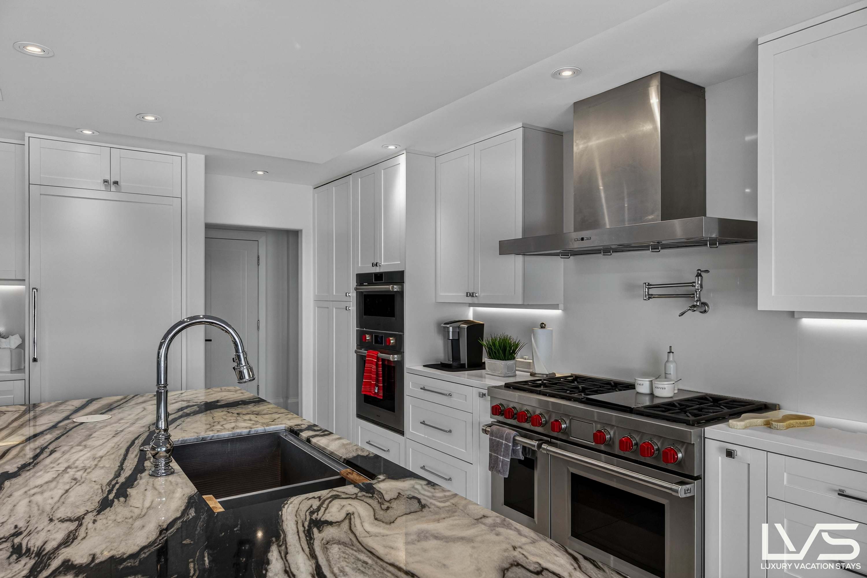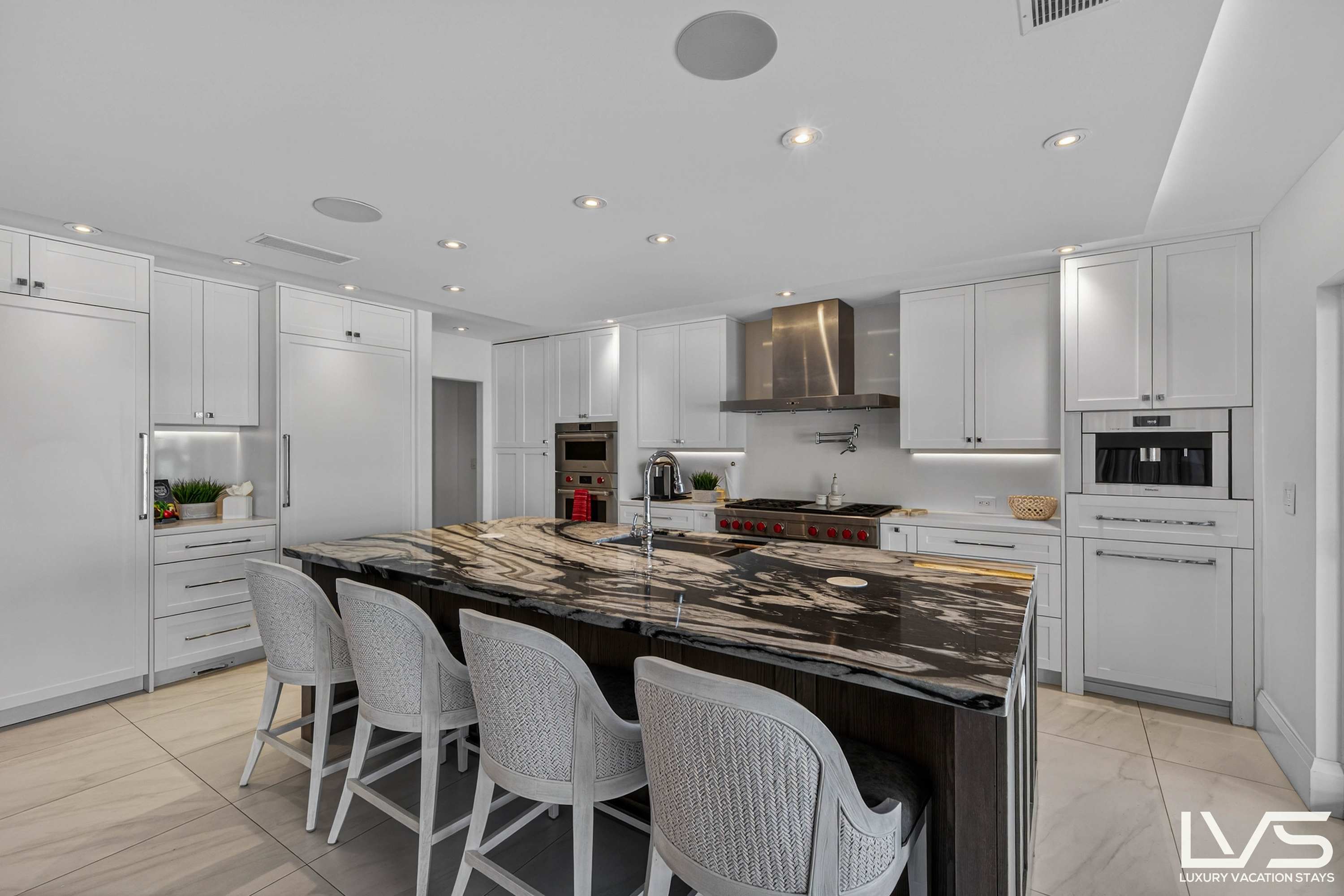 ● Fully Equipped Chef’s Kitchen: Premium appliances include Wolf range & oven, Wolf microwave & oven, Sub-Zero fridge & freezer, coffee maker, complete dishware, silverware, wine & drink glasses, plates, and cooking utensils. Kitchen counter seating for 4.