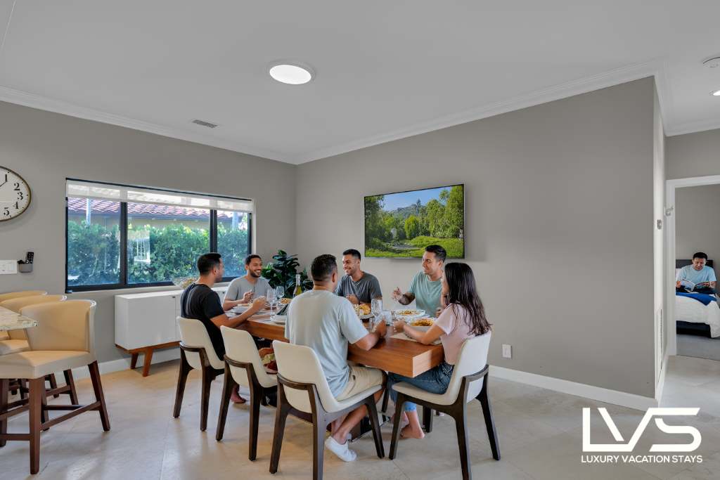 ● Dining Room: Elegant wood dining table with seating for 8 and a smart TV for relaxed entertaining.